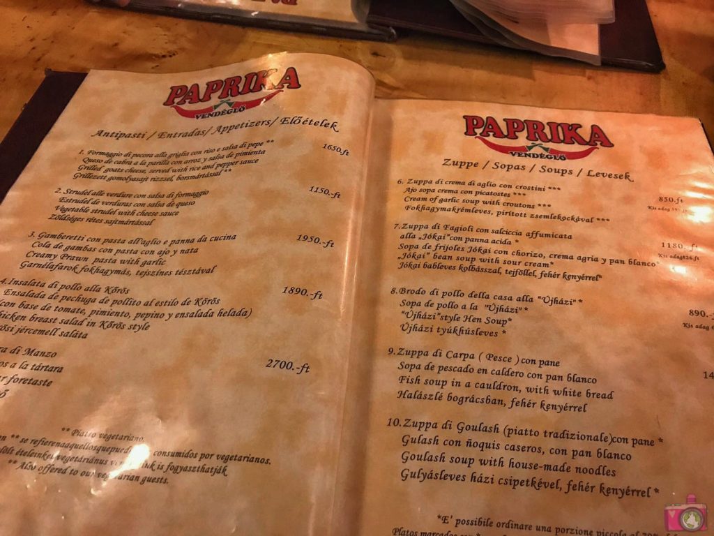 Abbiamo speso in totale 7.865 HUF (circa 25,50 euro, prezzi febbraio 2018) con una bottiglia di acqua e Coca-Cola, comprensivo del 10% di servizio. Puoi leggere qui il menù in italiano. Prenotazione altamente consigliata.