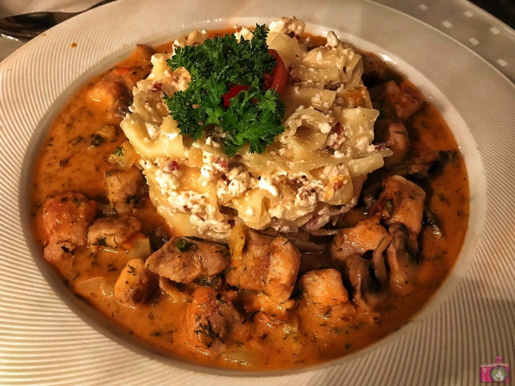Noi abbiamo ordinato le tipiche crepes alla Hortobágy ripiene di carne di pollo tritata (990 HUF) che mi sono piaciute moltissimo (avrei fatto il bis), un piatto di cavolo della Zia Betta ripieno di carne di maiale (1.750 HUF) e uno di gulasch di pesce gatto alla Dorozsma con pasta fatta in casa alla ricotta e pancetta (2.350 HUF).